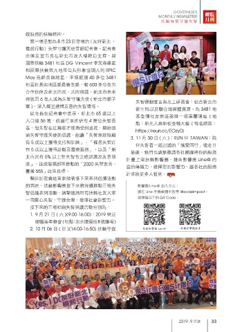 GOVERNOR'S MONTHLY NEWSLETTER 總監 扶輪有愛守護失智 月刊 影響圈 Line@ 加入方式: 請在 Line 手機軟體中搜尋 @socialimpact。 或掃描以下的 QR Code: 扶輪影響圈 Line@ 扶輪影響圈臉書 2019 . 9 月號 33