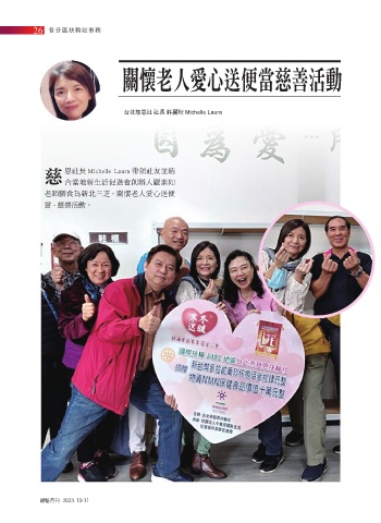 26 各分區扶輪社事務 關懷老人愛心送便當慈善活動 台北慈恩社 社長 許麗秋 Michelle Laura 慈 恩社長 Michelle Laura 帶領社友並結 合當地新生活促進會創辦人羅素如 老師膳食為新北三芝 ~ 關懷老人愛心送便 當 ~ 慈善活動。 總監月刊 2023. 10-11