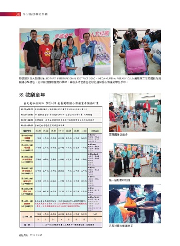 30 各分區扶輪社事務 特感謝來自大阪姊妹社 ROTART INTERNAEIONAL DISTRICT 2660,IKEDA-KUREHA ROTARY CLUB 連續第三年捐贈給台灣 偏鄉小學書包,充分展現國際服務的精神,真皮多功能書包老松把這份愛心傳達給學生手中。 ※ 歡樂童年 套圈圈看誰最多 搖一搖動動呼拉圈 乒乓球接力誰最神手 總監月刊 2023. 10-11