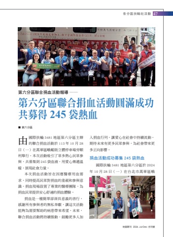 %u5730%u5340%u671f%u520a 2024. Jul-Dec %u5408%u520a%u865f%u5404%u5206%u5340%u6276%u8f2a%u793e%u6d3b%u52d547%u25a0%u7b2c%u516d%u5206%u5340%u7b2c%u516d%u5206%u5340%u806f%u5408%u6350%u8840%u6d3b%u52d5%u5831%u5c0e%u2015%u2015%u7b2c%u516d%u5206%u5340%u806f%u5408%u6350%u8840%u6d3b%u52d5%u5713%u6eff%u6210%u529f%u5171%u52df%u5f97245%u888b%u71b1%u8840%u7531%u570b%u969b%u6276%u8f2a 3481 %u5730%u5340%u7b2c%u516d%u5206%u5340%u4e3b%u8fa6%u7684%u806f%u5408%u6350%u8840%u6d3b%u52d5%u65bc 113 %u5e74 10 %u6708 28%u65e5%uff08%u4e00%uff09%u5728%u842c%u83ef%u5340%u5ce8%u5d4b%u8857%u7acb%u9ad4%u505c%u8eca%u5834%u65c1%u9806%u5229%u8209%u884c%u3002%u672c%u6b21%u6d3b%u52d5%u5438%u5f15%u4e86%u773e%u591a%u71b1%u5fc3%u6c11%u773e%u53c3%u8207%uff0c%u5171%u52df%u96c6%u5230 245 %u888b%u8840%u6db2%uff0c%u7528%u611b%u5fc3%u50b3%u905e%u6eab%u6696%uff0c%u5c55%u73fe%u793e%u6703%u529b%u91cf%u3002%u672c%u6b21%u6350%u8840%u6d3b%u52d5%u65e8%u5728%u56e0%u61c9%u91ab%u7642%u7528%u8840%u9700%u6c42%uff0c%u540c%u6642%u63d0%u9ad8%u6c11%u773e%u5c0d%u6350%u8840%u7684%u91cd%u8996%u548c%u53c3%u8207%u610f%u8b58%u3002%u6350%u8840%u73fe%u5834%u8a2d%u7f6e%u4e86%u5c08%u696d%u7684%u91ab%u7642%u5718%u968a%uff0c%u70ba%u6350%u8840%u6c11%u773e%u63d0%u4f9b%u5b89%u5fc3%u8212%u9069%u7684%u6350%u8840%u9ad4%u9a57%u3002%u6350%u8840%u662f%u4e00%u7a2e%u7c21%u55ae%u537b%u6df1%u5177%u610f%u7fa9%u7684%u5584%u884c%uff0c%u611f%u8b1d%u6240%u6709%u53c3%u8207%u8005%u7684%u7121%u79c1%u5949%u737b%uff0c%u8b93%u9019%u6b21%u6d3b%u52d5%u80fd%u5920%u70ba%u9700%u8981%u5e6b%u52a9%u7684%u75c5%u60a3%u5e36%u4f86%u5e0c%u671b%u3002%u672a%u4f86%uff0c%u806f%u5408%u6350%u8840%u6d3b%u52d5%u5c07%u6301%u7e8c%u63a8%u52d5%uff0c%u9f13%u52f5%u66f4%u591a%u4eba%u52a0%u5165%u6350%u8840%u884c%u5217%uff0c%u8b93%u611b%u5fc3%u5728%u793e%u6703%u4e2d%u6301%u7e8c%u6d41%u52d5%u3002%u671f%u5f85%u672a%u4f86%u6709%u66f4%u591a%u6c11%u773e%u53c3%u8207%uff0c%u70ba%u793e%u6703%u5e36%u4f86%u66f4%u591a%u6b63%u5411%u5f71%u97ff%u3002%u6350%u8840%u6d3b%u52d5%u6210%u529f%u52df%u96c6 245 %u888b%u71b1%u8840%u570b%u969b%u6276%u8f2a 3481 %u5730%u5340%u7b2c%u516d%u5206%u5340%u65bc 2024%u5e74 10 %u6708 28 %u65e5%uff08%u4e00%uff09%u5728%u53f0%u5317%u5e02%u842c%u83ef%u5340%u5ce8