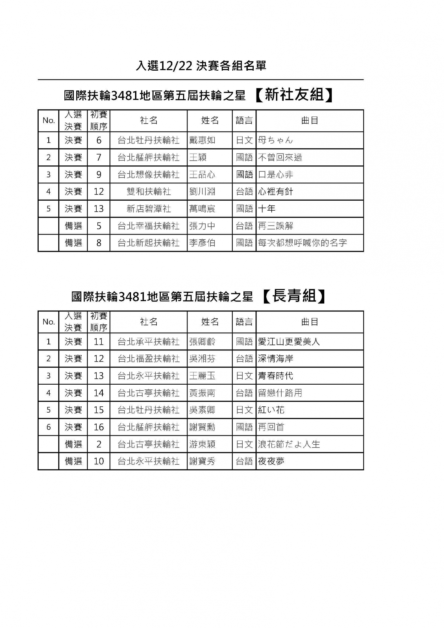 本屆的歌唱比賽分成兩組: